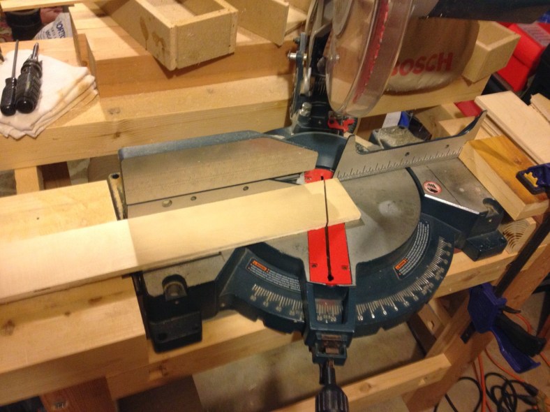 With the deck squared away I moved on the base. For miters I like to leave the blade in place and flip the wood so the angles are always complimentary. I also clamped a piece of wood to the right of the saw as a fence.